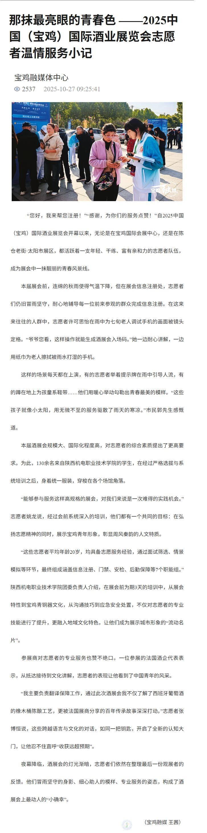 “您好,我来帮您注册!”“感谢,为你们的服务点赞!”自2025中国(宝鸡)国际酒业展览会开幕以来,无论是在宝鸡国际会展中心,还是在陈仓老街·太阳市展区,都活跃着一支年轻、干练、富有亲和力的志愿者队伍,成为展会中一抹靓丽的青春风景线。